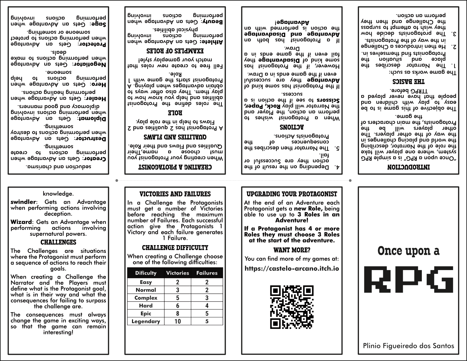 “Once upon a RPG” is a simple RPG system, based around Rock, Paper, Scissors, where each Protagonist has a role that gives them advantages to surpass the challenges in their way!